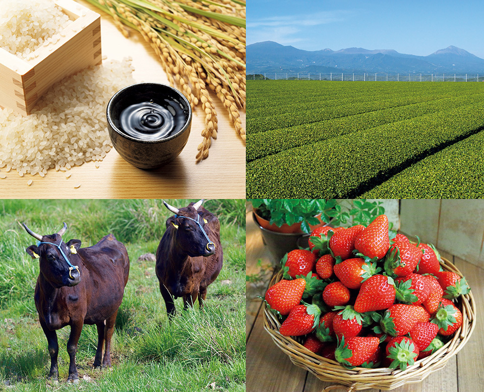 Japan’s agricultural, forestry, and fishery exports have an excellent reputation. Clockwise, from top left: rice and sake, tea fields, strawberries, and cattle used in wagyu production.