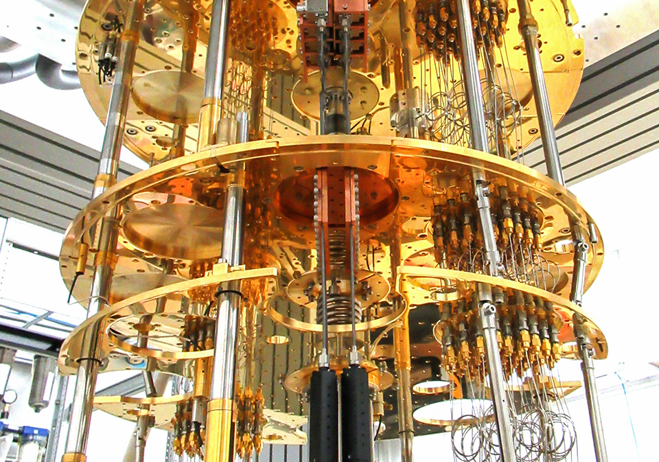 The inside of the superconducting quantum computer. Superconducting qubits only function in a state of superconductivity, in which electrical resistance disappears. They are stored in a cooling device that produces the superconducting state and reduces errors by lowering the temperature to near absolute zero (−273.15ºC + 0.01ºC). RIKEN CENTER FOR QUANTUM COMPUTING