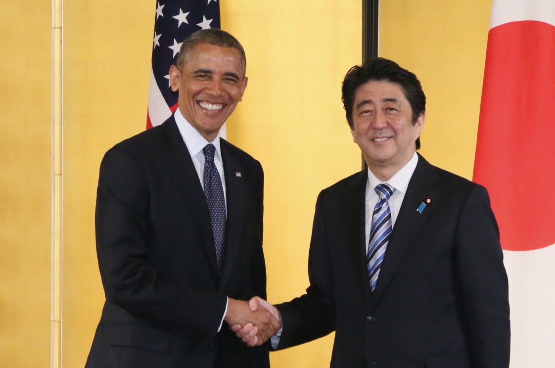 Shaking hands with President Obama at Japan-U.S. Summit Meeting.