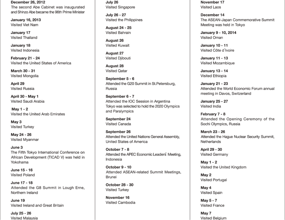 After Prime Minister Shinzo Abe inaugurated his administration, he took stock of the world situation and began to actively engage with other countries both abroad and in Japan. In the course of the last twelve months or so, he has held dialogues with many world leaders while also tackling domestic issues in an appropriate manner.