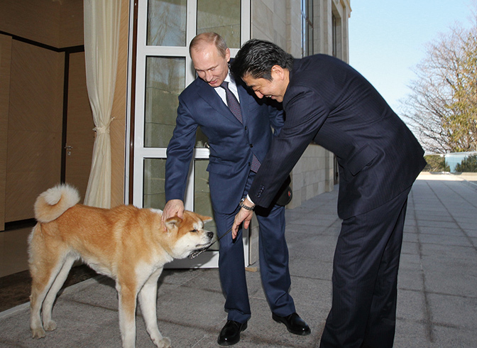 In Sochi to attend the opening ceremony of the XXII Olympic Winter Games. With President Putin is Yume, the Japanese Akita dog that he received as a gift from the governor of Akita Prefecture in 2012 (February 2014).