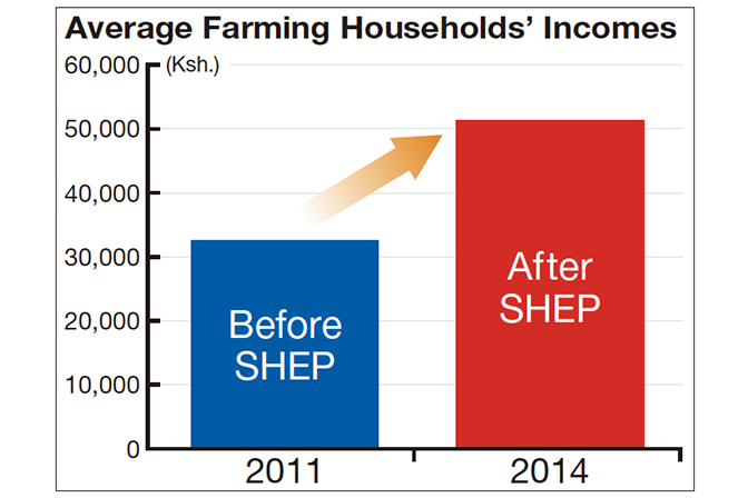 These activities have been steadily producing results. From 2011 to 2014 the real horticultural incomes of the targeted farming households rose by 58%. And people report that their lives have improved, saying, for example, that they have become able to send their children to a private middle school or that they used their earnings to start a new business. Kenyan government authorities have recognized that the SHEP approach is effective in increasing farmers’ incomes, and from 2010 to 2015 it was implemented in 33 out of the nation’s 47 counties.