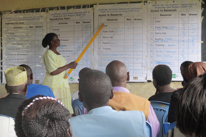 The gender training conducted as part of the SHEP approach is an important means of raising farmers’ incomes. In many Kenyan farming households, males tend to handle the decision making about what to plant and what to buy; relatively few couples discuss such matters and decide jointly. “Gender training sessions lead to more discussion between husbands and wives, with husbands becoming more likely to share the chores previously handled mainly by their wives and to consult with their wives when deciding what equipment they should buy. When a couple buys a water tank at the wife’s request, her water-drawing burden is lightened, and she can devote the saved time to farming, which leads to more income.”