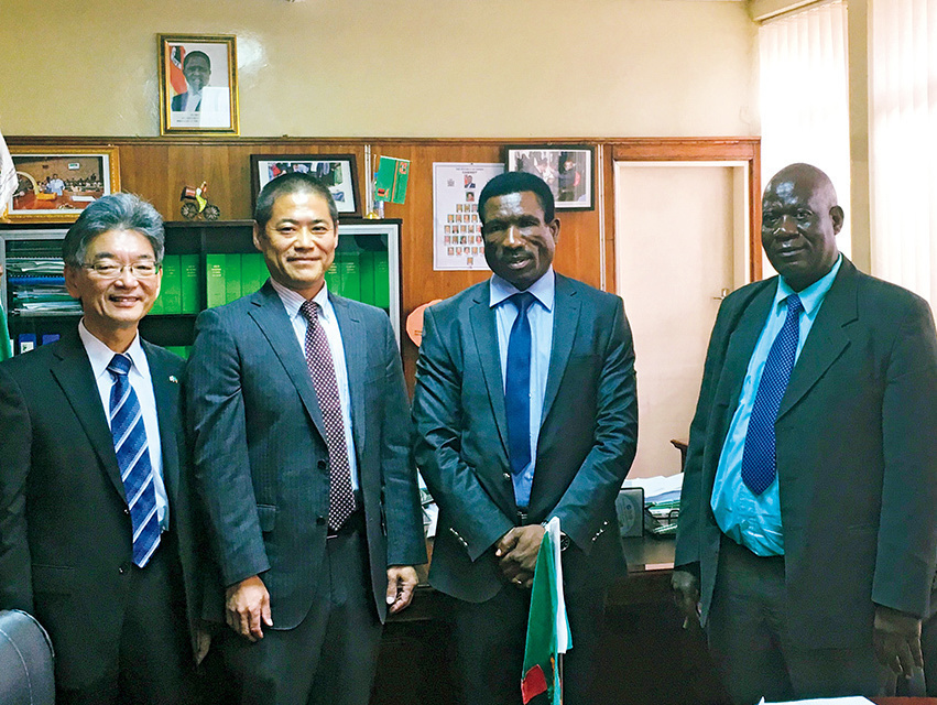 Inoue warmly welcomed in Zambia, From left to right: Hidenobu Sobashima: Ambassador Extraordinary and Plenipotentiary of Japan; Yutaka Inoue: Senior Agricultural Advisor to the Ambassador of Japan and the Advisor to the Department of Agriculture of Zambia; Micheal Z.J Katambo: Minister of Agriculture, Republic of Zambia; Peter K. Lungu: Director of Department of Agriculture, Ministry of Agriculture, Republic of Zambia.