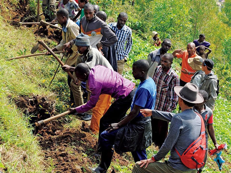 Rwandan coffee producers listen to Kawashima as he explains how to make terraced fields.