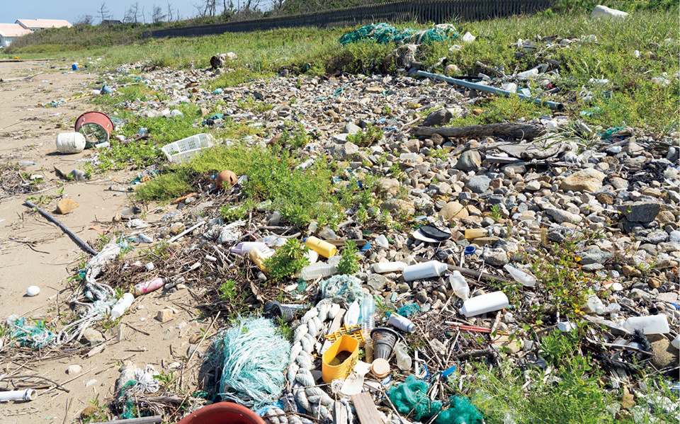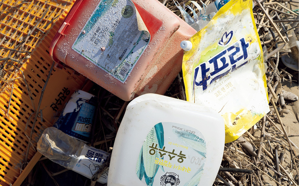 A huge amount of garbage drifts ashore onto a beautiful beach in Hakui. Much of the plastic waste is labeled with non-Japanese writing.
