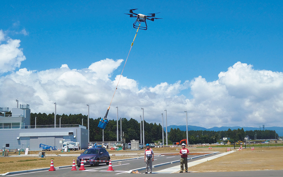 A variety of demonstrations are conducted at this robot test field. In the photo, physicians from Bokutoh Hospital in Sumida City (Tokyo) are conducting a test to determine whether blood for a transfusion can be transported via a drone.