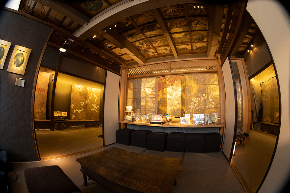 Not far from Tokyo University of the Arts is Yanaka, a temple neighborhood of Tokyo from the Edo period (1603-1867) with many old Japanese buildings still standing. West was fascinated by that part of Tokyo, packed full of well-known stores specializing in nihonga materials. This fascination led him to renovate an old auto body garage so that he could open his own Japanese-style studio-cum-gallery in the neighborhood. Stepping inside, the visitor is transported into a magical world full of art painted with gold, silver, and copper leaf, as well as containers filled with finely powdered natural mineral pigments. It’s not unusual for neighbors to stop by for a glance of his artwork, which offers them a distinct sense of the changing seasons.