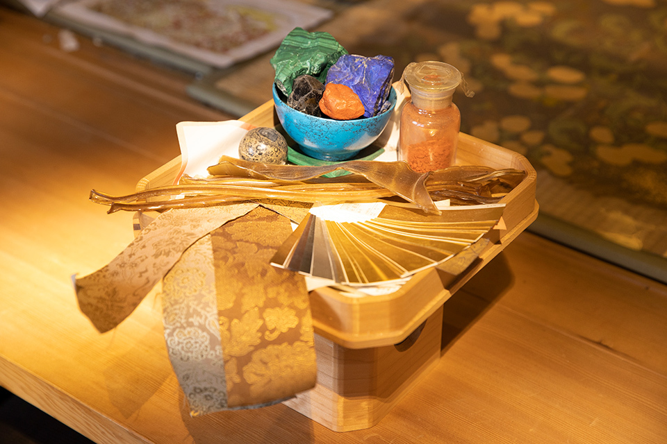 Pigments are made from natural minerals such as lapis lazuli and malachite. Additionally, glue, which is hardened into a stick for longer storage, and gold leaf are used.