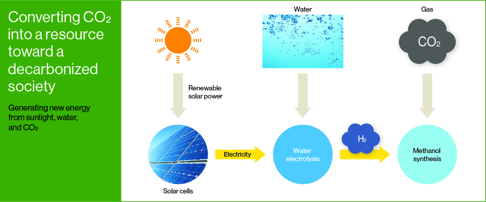 Along with the shift to replace fossil fuels with renewable energies such as hydrogen, another important measure to achieving a decarbonized society is carbon recycling, effectively using CO2 as a resource. In consideration of that viewpoint, Dr. Fujishima has proposed the following method; first, extract hydrogen through water electrolysis using the electricity produced from highly efficient solar cells. Next, combine the extracted hydrogen with the CO2 emitted from power plants and factories to produce methanol, which can be used as an energy source. If this process is realized, gases containing carbon, such as CO2, will no longer contribute to the greenhouse effect. Rather, those gases will become “resources” to replace oil and natural gas.
