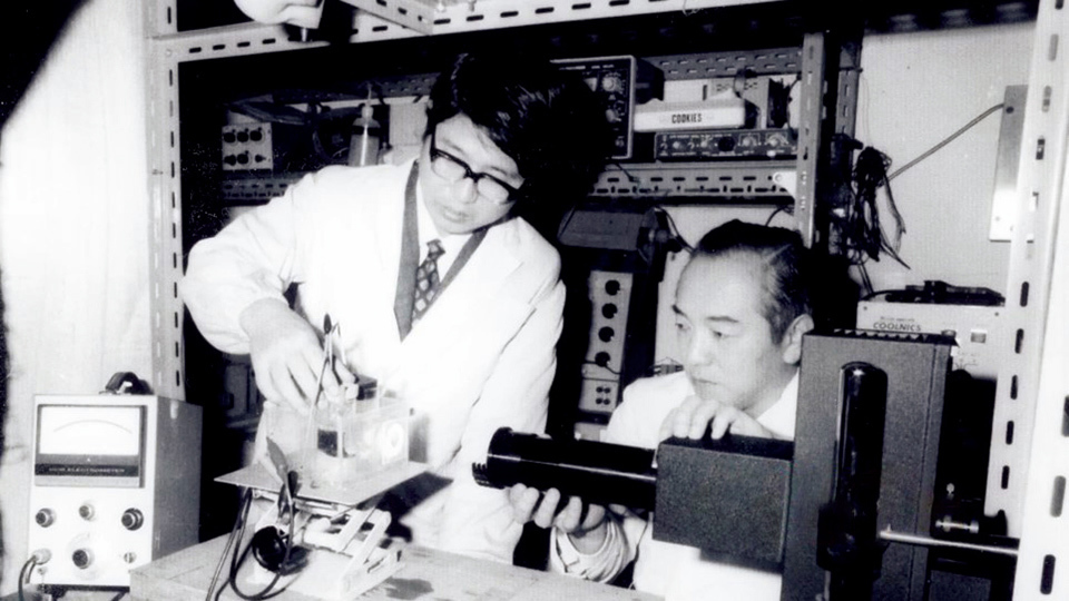 Fujishima (left) conducting an experiment with Dr. Honda in 1967. Initially, nobody believed the pair’s findings, namely, that water could be broken down with light energy alone.