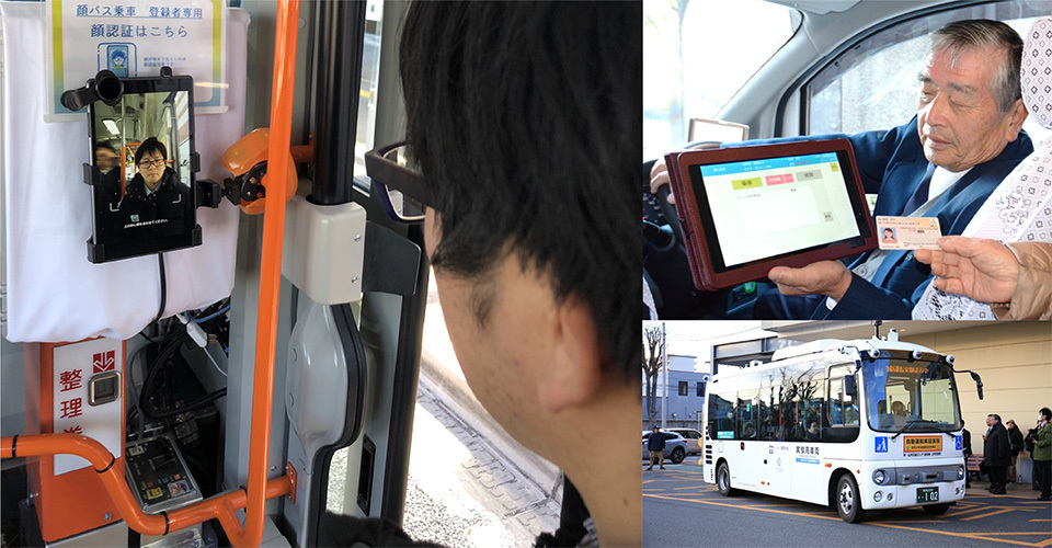 A city-specific initiative in Maebashi offers half-price taxi fares to passengers who may have limited mobility; they use it by simply scanning their My Number Card when getting in a taxi (top right). The city is also trialing autonomous buses that are linked to the cards and require only facial recognition to ride.