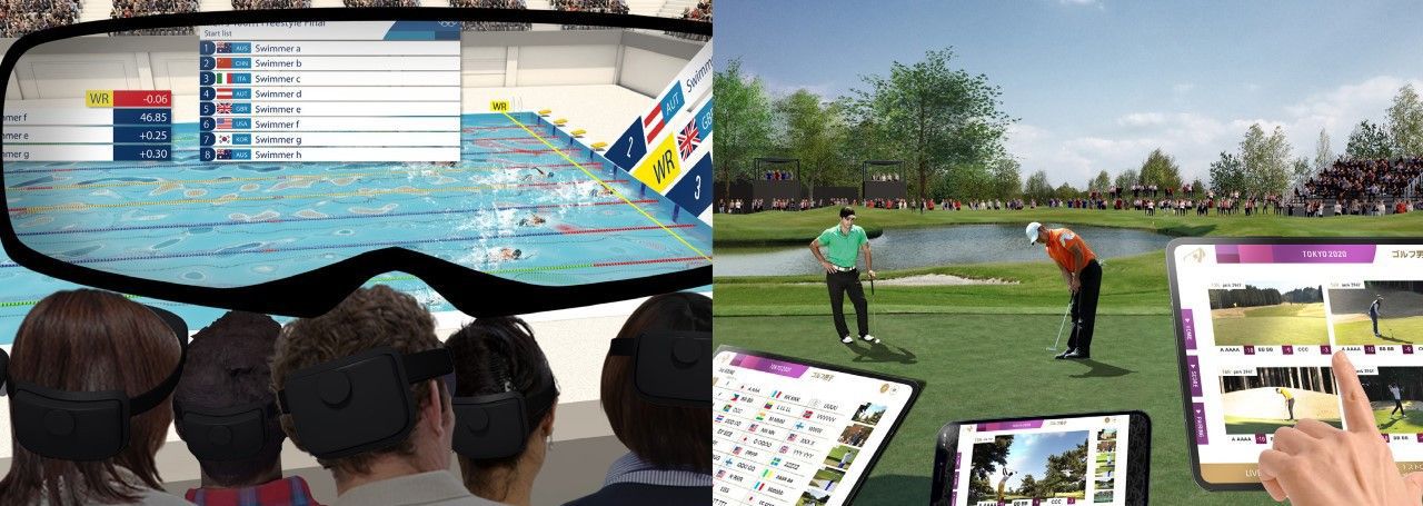 Right: Spectators at a golf competition can simultaneously view multiple players scattered along the course on a hand-held device. TOKYO 2020
