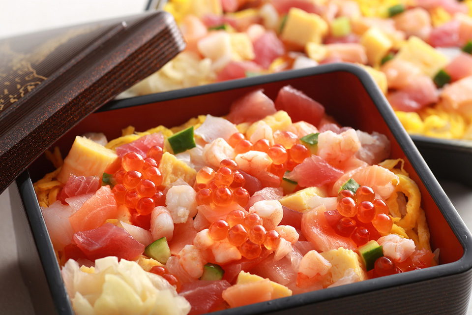 No flower-viewing party or spring banquet is complete without vividly colorful sprinkled sushi (chirashi sushi). Sushi rice, flavored with vinegar and sugar, is festooned with seafood, vegetables, and other treats, truly expressing the joy of welcoming a new season. With a different character for each region and household, even for Japanese people this is special. Schools, businesses, and other Japanese institutions start a new year in April. Everyone gathers around a table laid with festive foods and celebrates the season of new beginnings.