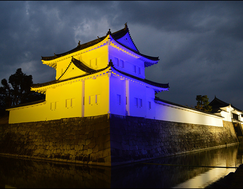 Blue and yellow, the colors of the Ukrainian national flag, lighting up buildings all over Japan. Tokyo Metropolitan Government Building (top) and Nijo Castle in Kyoto, a sister city of Mariupol, in Ukraine, show their solidarity with the country. MAINICHI / AFLO (TOP), IMAGEMART (BOTTOM)