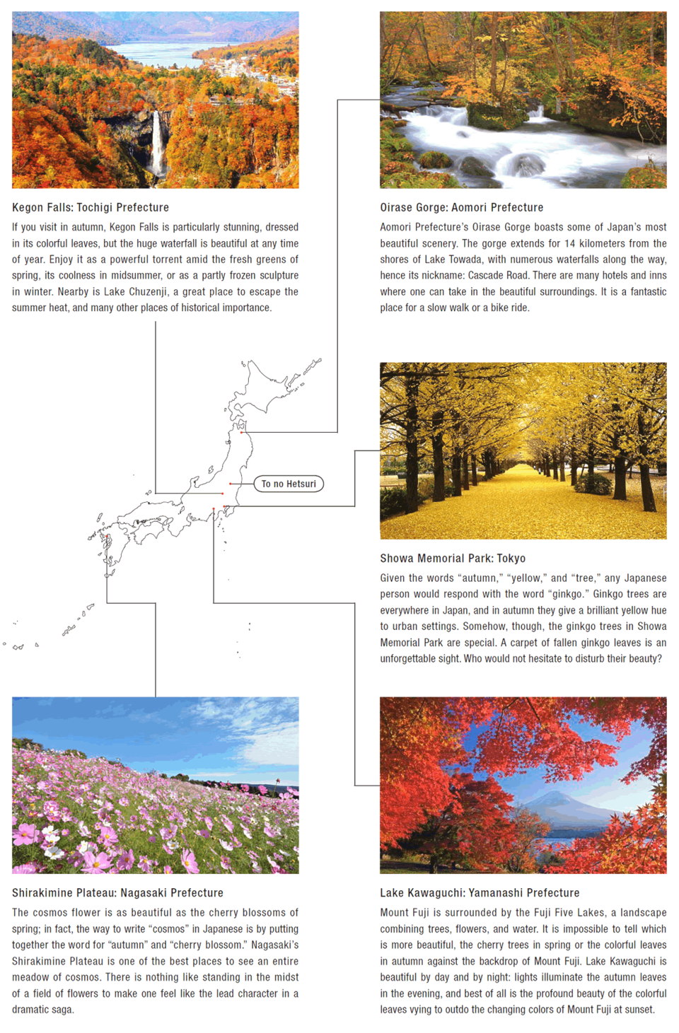 Japan is blessed with four seasons, which Japanese people celebrate and mark with f lowers and poems appropriate to the time of the year. Another way that Japanese people show their appreciation for the seasons is with color. For winter there is the white of snow; for spring, the pink of cherry blossoms and various shades of green. Summer is the time of the blue ocean and sky.