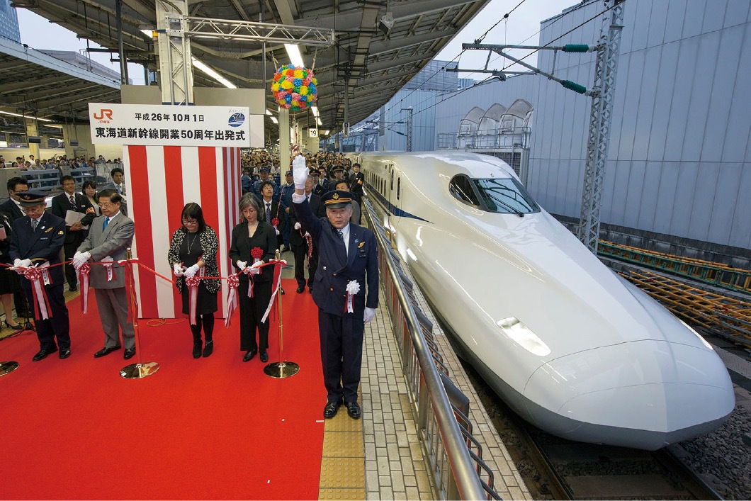 Shinkansen (lit. new trunk line), Japan’s high-speed rail, celebrates its 50th anniversary in 2014, having opened for service between Tokyo and Osaka in 1964. Over the past half century, the made-in-Japan technology behind these sleek trains has continued to evolve. Top speed has risen from 210 km/h (130 mph) to 320 km/h (200 mph), and ridership is now 1 million passengers per day.