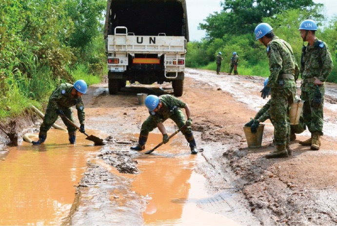 At the time of the independence of South Sudan, the United Nations Mission in South Sudan (UNMISS) was established by UN Security Council Resolution No. 1996 in 2011, with the aim of fostering state building. After receiving requests from the UN, Japan has dispatched around 400 personnel to South Sudan. Up to now, the SDF has been engaging in engineering activities in the capital, Juba, and its surrounding areas while coordinating with international organizations, troops from other countries, NGOs, and the Ministry of Foreign Affairs. Since the deterioration of the security situation in December 2013, the SDF is currently conducting activities to support Internally Displaced Persons (IDPs) at the UN facilities located in Juba, South Sudan. The engineering unit has been engaging in various activities for locals including the construction of IDP camps and water supply.