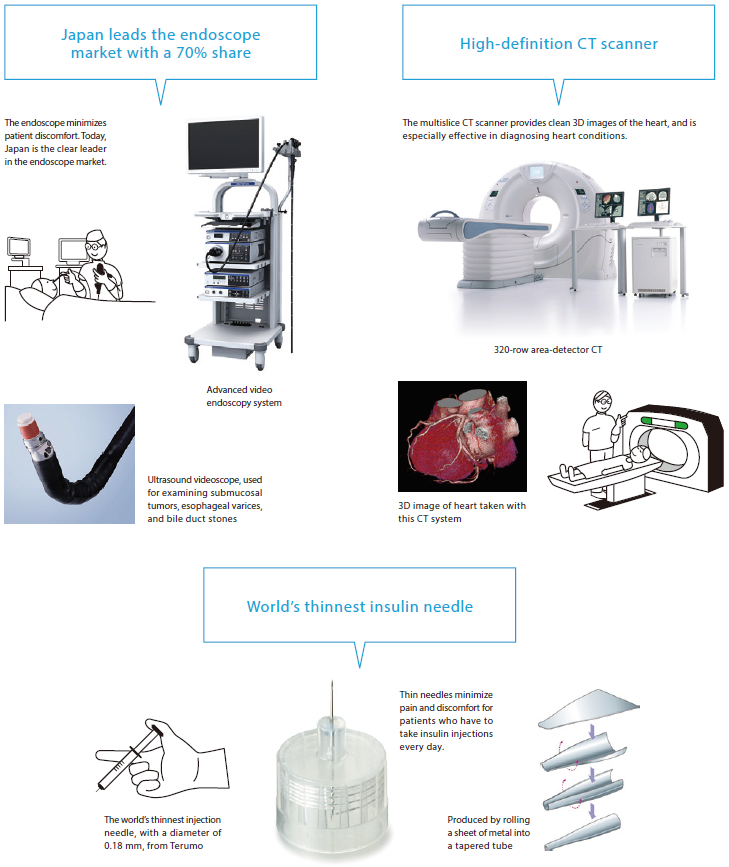 One aspect of Japan’s medical services gaining global attention is the provision of minimally invasive treatment, in which patients are effectively diagnosed and treated with a minimum of stress. This is made possible by medical equipment that is easy on the patient’s body. Prime examples include endoscopes, for which Japan holds a 70 percent share worldwide, diagnostic imaging equipment that enables high-definition, high-speed imaging, and the world’s thinnest injection needles, which minimize patients’ pain.