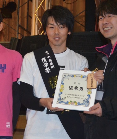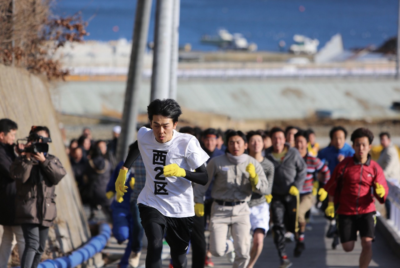 The day before the festival, Onagawa held a race starting at 3:32 p.m., the time that the tsunami struck in 2011, on a course from where the town center formerly stood to a safe spot on high ground. The first three runners to reach the goal won the title Fukko-otoko, or “Happiness Recovery Man.”