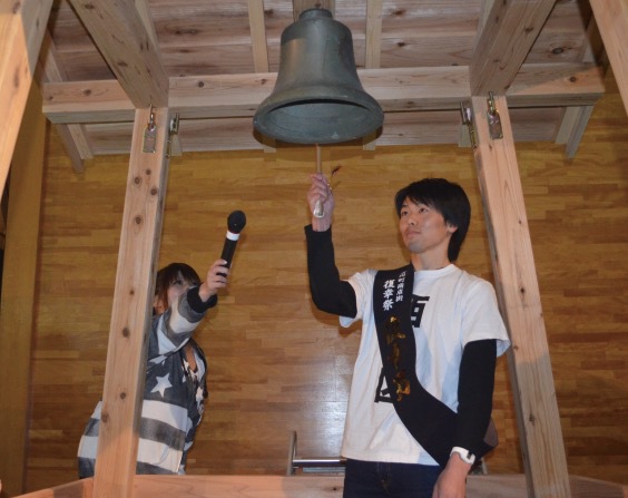 To mark the start of the festival, the top runner rings the Kibo no Kane, or Bell of Hope, which had been in front of the town’s train station before the tsunami and was found in the rubble after the disaster.