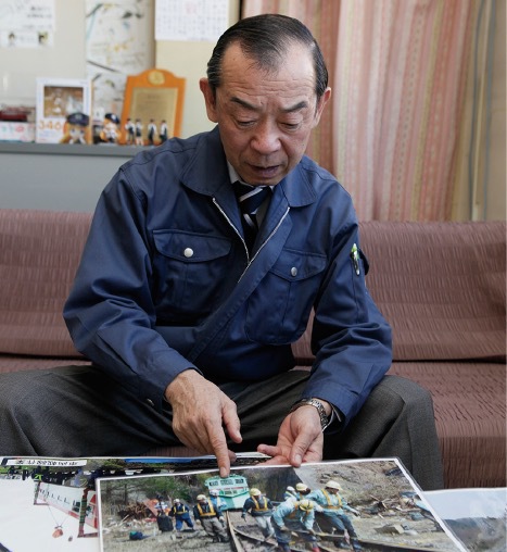 Mochizuki, the president of Sanriku Railway, points at a picture of one of the new cars, expressing appreciation and saying that the railway will make good use of them.