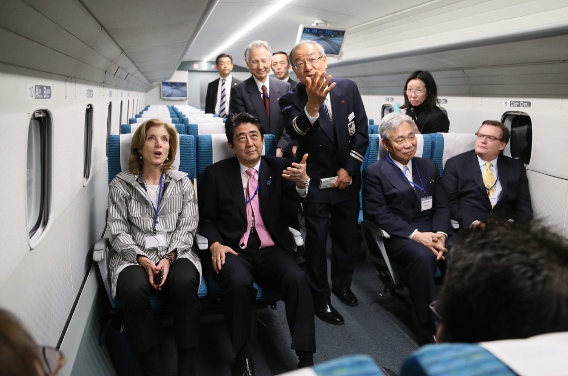 Listening to a technical explanation during maglev train test ride with U.S. Ambassador Caroline Kennedy, April 2014.