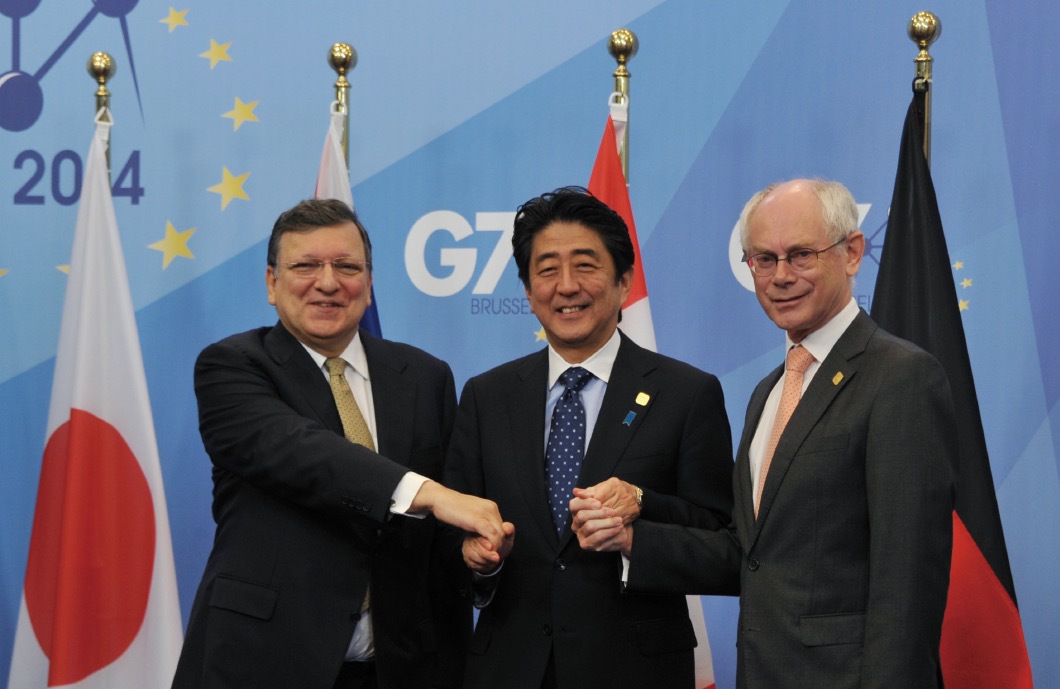 Joining hands with European Council President Herman Van Rompuy and European Commission President José Manuel Barroso during the G7 Meeting in Brussels, Belgium, June 2014.