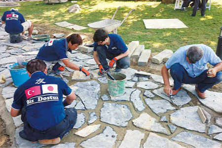 Experts wearing uniforms with the Japanese and Turkish flags work on this year’s renovation project.