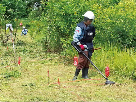 It is Imai’s job to improve the capabilities of local demining crew members. This involves training them how to perform all the stages of manual removal, from detection to detonation, as well as teaching them how to operate mine-clearing equipment. He and a colleague provide classroom and field training to 60 Cambodian crew members. It is a tough job, conducted in scorching heat with danger as a constant companion.