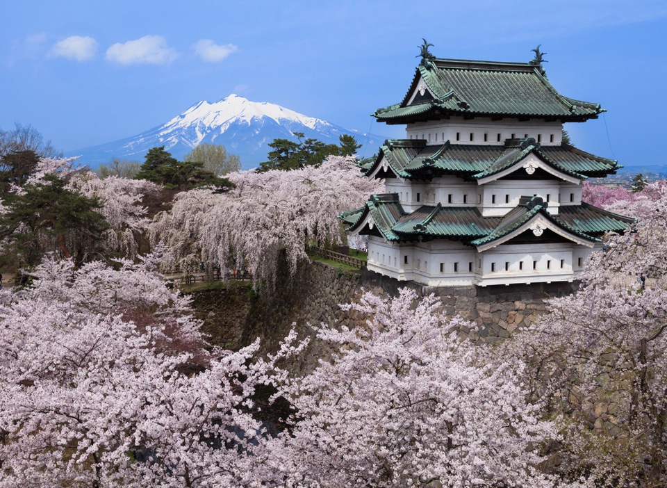 The cherry blossom is the flower most representative of Japan, heralding the arrival of spring. Since ancient times, cherry blossom viewing has been one of the greatest pleasures of springtime for the Japanese. At this time of year, all Japan is obsessed with cherry blossoms. People track the “cherry blossom front line,” the map showing the geographic area where the cherry trees are in bloom, as the leading edge moves up the Japanese archipelago from south to north, dyeing the nation with the pale pink of spring. Hirosaki Castle, in the Tohoku region, is surrounded by beautiful cherry trees and renowned as one of the best settings in Japan to view these picturesque blossoms.