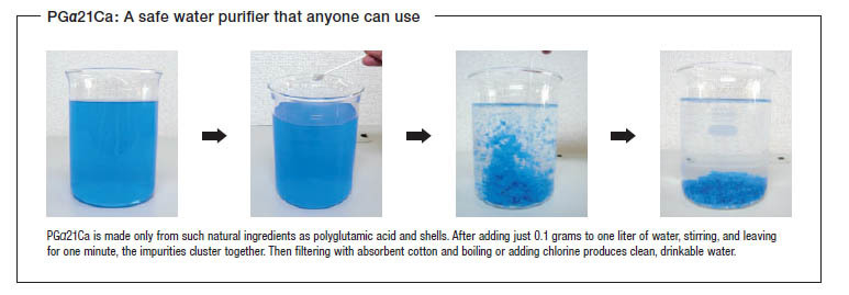 With just a spoonful of white powder stirred into a beaker of brown, cloudy water, the dirt visibly clumps together and the water starts to clear. “Be it in Bangladesh or Tanzania, even if there’s a language barrier, when I conduct this demonstration, people ooh and aah, and faces break into smiles. I’ve even heard the startled response, ‘It’s magic powder!’” So relates Kanako Mizuno of the Poly-Glu Group.