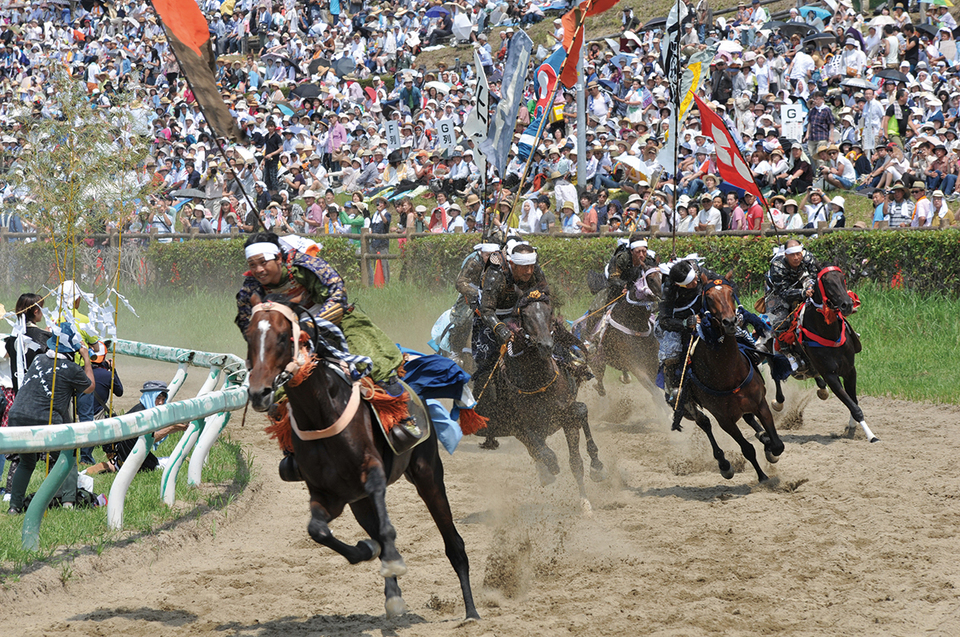 Minamisoma, a city in Fukushima Prefecture, is located about three hours by train or car north of Tokyo. Soma Nomaoi, an equestrian event with roots in tenth-century military exercises using wild horses and in the custom of offering horses to the divinities, is held here in late July every year. During the festival, the city presents scenes that take viewers centuries into the past, including a parade of 500 mounted warriors clad in traditional armor and surcoats passing through the streets along a 3-kilometer (1.8-mile) course. There is also the breathtaking spectacle of armored young warriors in groups of 10 racing their fleet steeds at breakneck speed around an earthen track, casting up plumes of dust as they go.