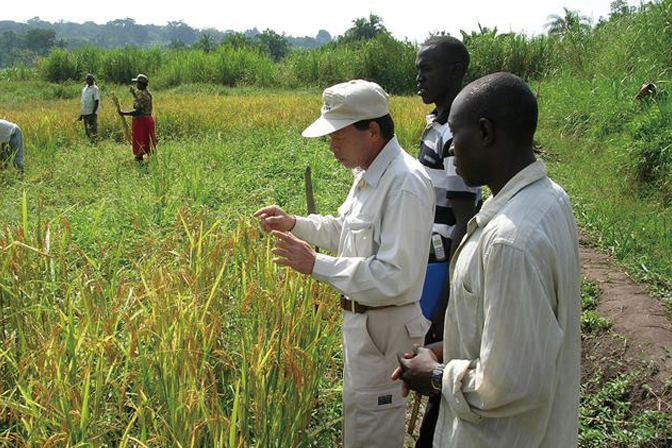 Tsuboi provides guidance in Uganda. In addition to guidance for farmers, Tsuboi, operating from a Nerica rice-growing test station in Uganda as his base, trains extension workers and researchers. He has trained over 2,000 such professionals in countries around Africa.