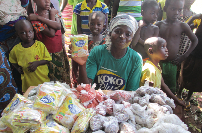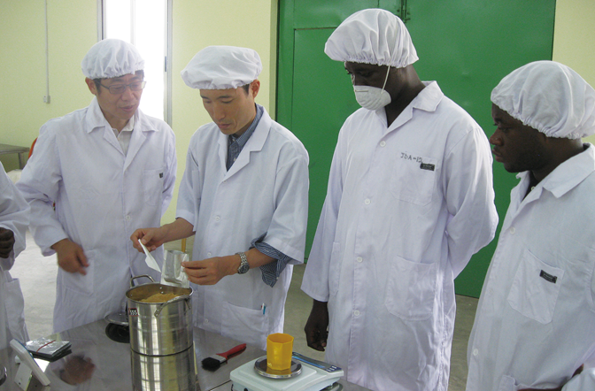 In 2009, as one of the initiatives commemorating its centenary, Ajinomoto launched the Ghana Nutrition Improvement Project, aiming to utilize its vast store of knowledge on food products and amino acids to help solve problems that developing countries are facing. This project, led by Dr. Toride, developed KOKO Plus, a supplement to be added while cooking koko. The main ingredient is soybeans, which are locally grown, together with an amino acid (lysine) and micronutrients (vitamins and minerals). Palm oil and sugar are added to get the taste just right.