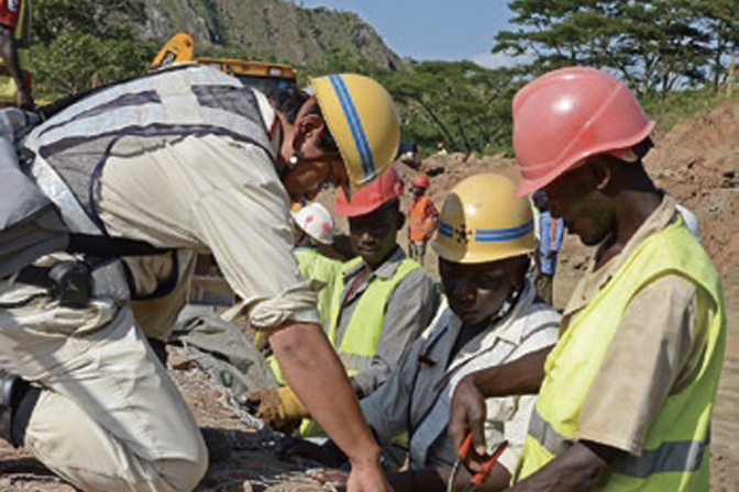 An engineer from a Japanese construction company (left) provides guidance to local engineers as they work together on the project.