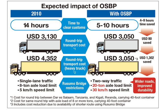 The new two-lane bridge, built with high-level Japanese technology, eases passage by allowing twoway traffic. And the new OSBP complex reduces congestion and promotes smoother cross-border trade: Whereas previously it was necessary to go through customs separately on both sides, a process that could take about 14 hours, now the procedures can be completed more expeditiously in one stop. Over a period of eight years the Japanese government worked steadily with various government organs in Rwanda and Tanzania and with the East African Community (EAC), which has been promoting the adoption of the OSBP concept, to support the enactment of relevant legislation. JICA also assisted with the preparation of operational manuals and technical training for customs officials. On March 1, 2016, the long-awaited OSBP was inaugurated, greatly shortening the time required to clear customs. JICA estimates that in the first year of operation, the new facility will result in savings of USD 1.8 million in costs for round-trip transportation between the port of Dar es Salaam in Tanzania and Kigali, capital of Rwanda. And the improvement of the Central Corridor logistics network will promote the flow of goods and contribute greatly to the economic development and modernization of East Africa’s inland nations.