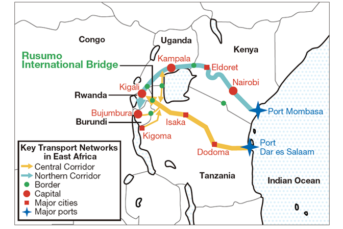 The major roadways for transport of goods from the Indian Ocean to inland areas. The Northern Corridor was formerly the most-used route, but two border crossings made it time consuming. With the inauguration of the new bridge and OSBP, the Central Corridor has come to play a much bigger role as a transport route.