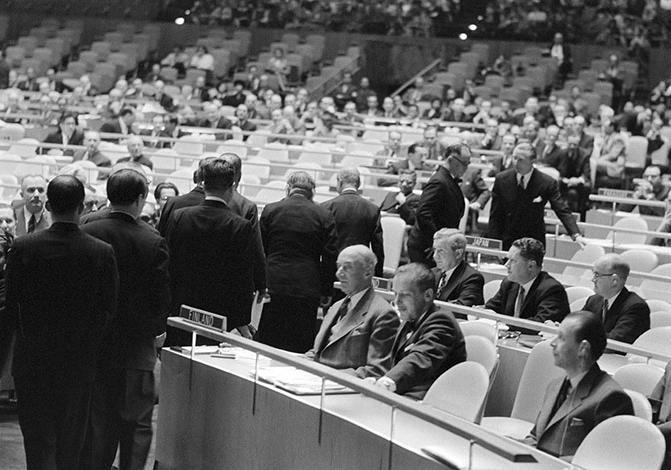 Japanese Foreign Minister Mamoru Shigemitsu observes the hoisting of the Japanese national flag to mark Japan’s accession to the UN (December 19, 1956).