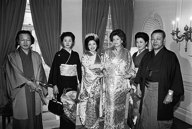 Marcela Temple Seminario, the wife of UN Secretary-General Javier Pérez de Cuéllar, dressed in a kimono, together with the Japanese Kimono Cultural Mission members visiting the UN to introduce Japanese kimono culture (April 4, 1982).