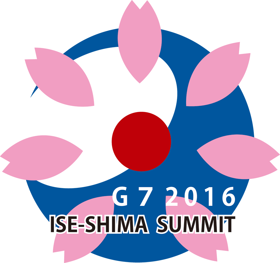 The red disc featured on Japan’s national flag is circled by cherry blossom petals signifying the G7 countries. The blue crescent represents the ocean surrounding Ise-Shima, the venue of the G7 Summit. This logo was designed by a high-school student.