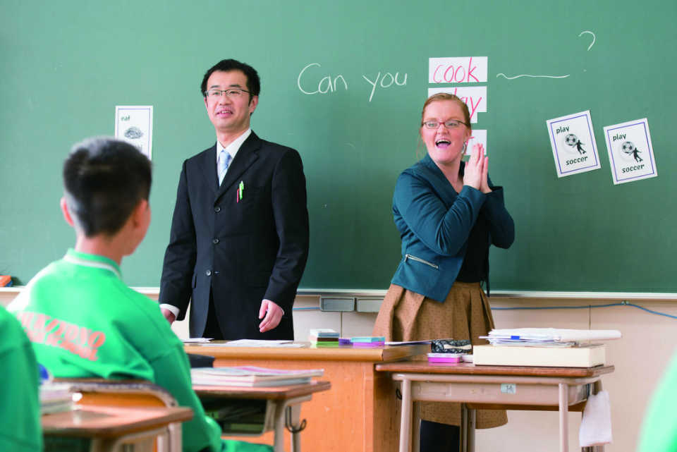 Smith demonstrates with the Japanese English teacher a new grammar structure to a first-year class. She combines cards and lively examples to keep the interest of students high.