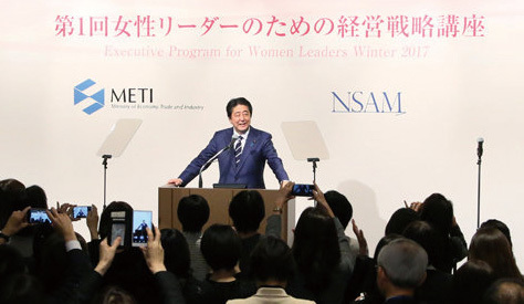 Prime Minister Abe attended a reception for the Executive Program for Women Leaders, a seminar organized by the government in cooperation with the private sector to foster strategic management, leadership, and other critical skills among female leaders. There he delivered remarks saying Japan aims to increase the number of female board members as an economic policy, not as a social policy, and that by doing so, Japan will be able to realize further growth. (January 2017)