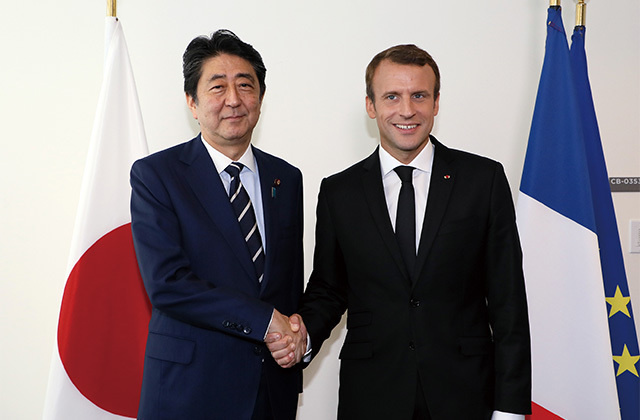 Meeting with the Honorable Donald J. Trump, President of the United States of America, and H.E. Mr. Moon Jae-in, President of the Republic of Korea, in New York. The three countries’ leaders shared the view that amid the growing threat of North Korea, they must deepen collaboration under the unity of the three countries, such as by increasing efforts to encourage joint pressure from the international community. (September 2017)