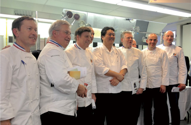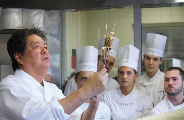 Koyama’s activities as an ambassador of washoku in France began in 1992, when he gave the first-ever lecture on Japanese food to be delivered at Ferrandi. He reflects on his thoughts at the time: “Japanese chefs who had studied the secrets of French cooking in France were finding success in Japan. I wanted in return to introduce Japanese culinary techniques to France.” The only tools of his trade that he brought from Japan were his knives and soy sauce. “I will present you with genuine Japanese cuisine using solely French ingredients,” he wrote in the invitation sent to noted French chefs. Although he was little known in France at the time, 86 leading chefs packed the lecture room. One of the attendees was Pierre Hermé —one of the most renowned pâtissiers in France—who said of his first-hand encounter with Koyama’s knife skills, “I will never forget discovering that the manner in which the knife is applied alone can change the taste of sashimi so dramatically.” Koyama, for his part, was struck by the sheer passion of these foremost chefs for culinary inquiry.