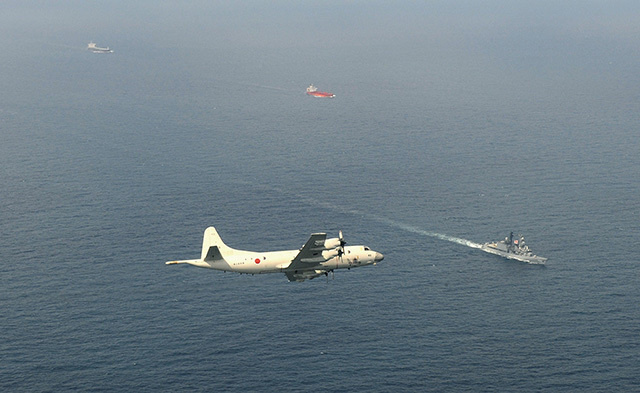 The Japanese destroyer Hamagiri and P-3C patrol aircraft performing an escort mission in the Gulf of Aden.