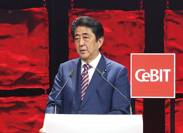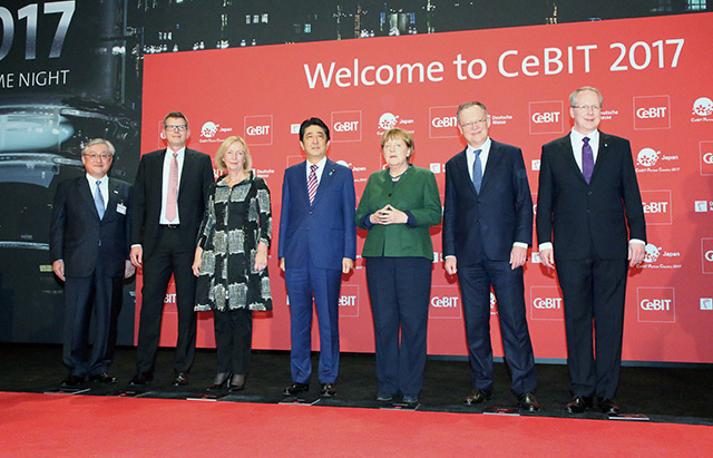 It all dates back to May last year. Chancellor Angela Merkel and I were meeting, and at one point she asked me, “Why don’t you make Japan a partner country at the CeBIT* next year? And you must also come.” Angela, I am indeed here. Japan is indeed a partner country. And also, Japanese companies are here, in a massive number, which is 118, a jump of more than tenfold from the previous year.
