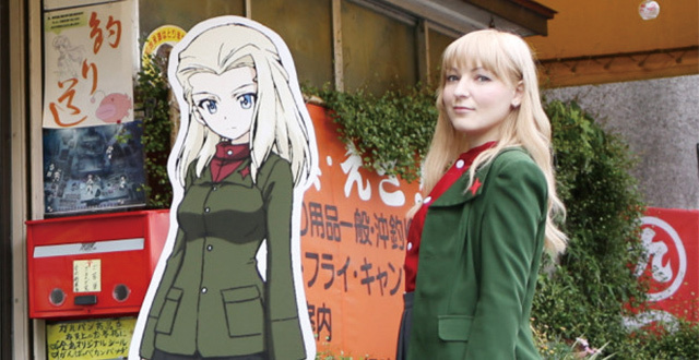 Jenya in matching cosplay next to a life-size cardboard cutout of her character Clara from GIRLS und PANZER der FILM.