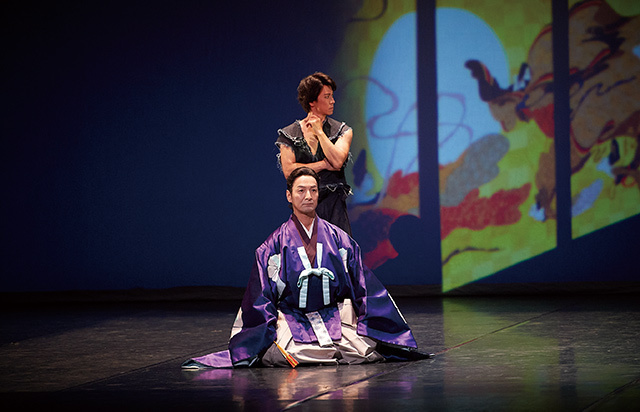 In NOBUNAGA, an original ballet fused with Japanese dance and featuring feudal lords of Japan’s Warring States period as a motif, Iwata performed alongside Farukh Ruzimatov (the former principal dancer of the Mariinsky (Kirov) Theatre and current artistic advisor of the Mikhailovsky Theatre) and Japanese classical dancer Rankoh Fujima.