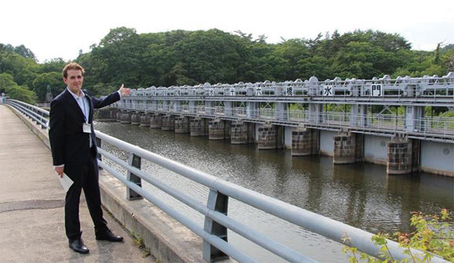 Joost standing in front of the Jurokkyo Sluice Gate, a key component of the Asaka Canal construction project. It regulates the water level of Lake Inawashiro while allowing water to flow to the Asaka Plains.